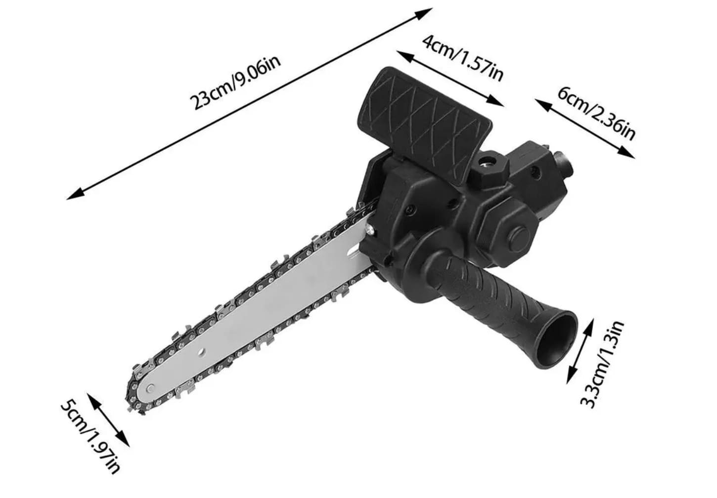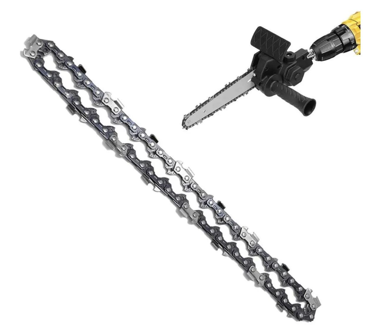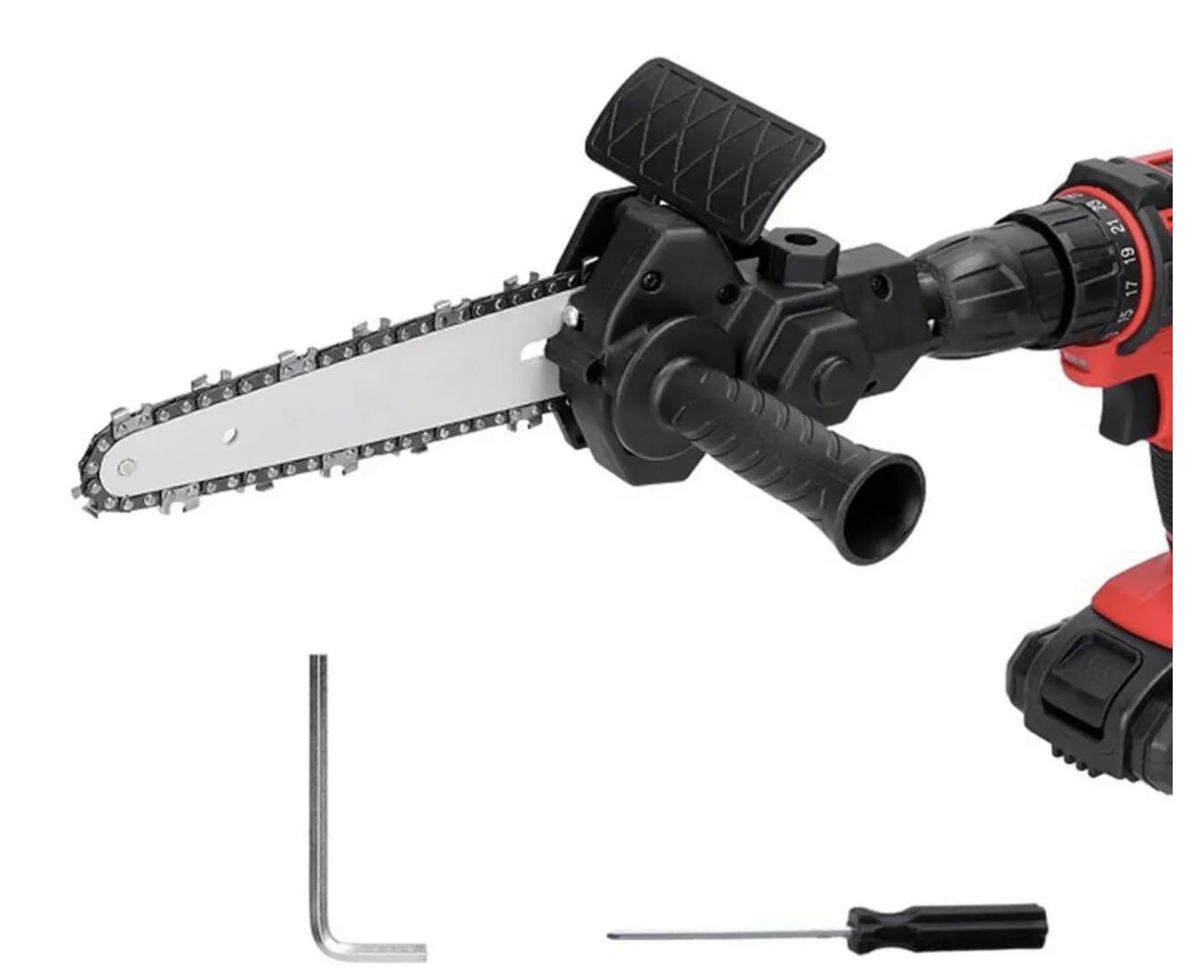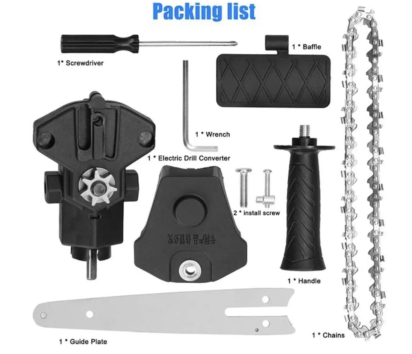 В комплекте идет инструмент, позволяющий удобно и легко переработать электрическую дрель на электрическую бензопилу вместо того, чтобы покупать новую электрическую бензопилу.